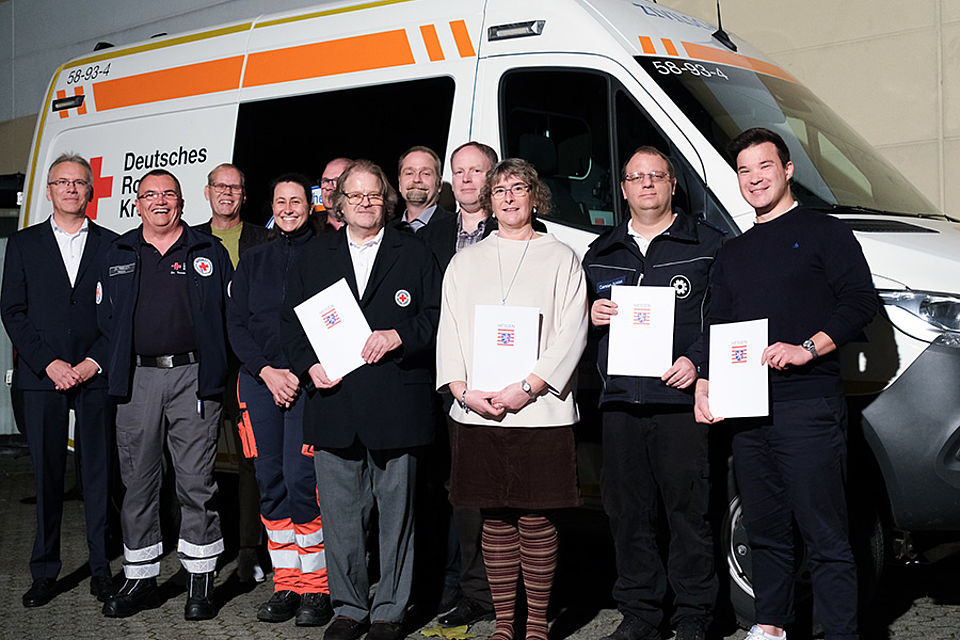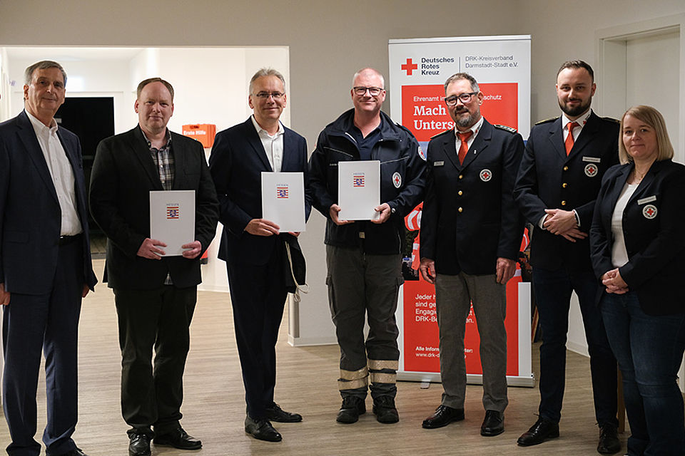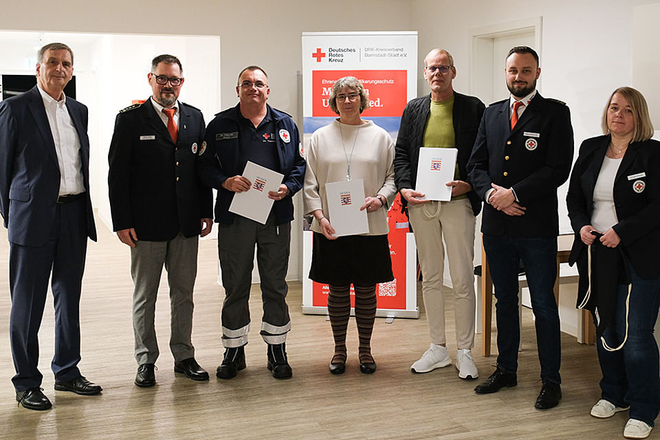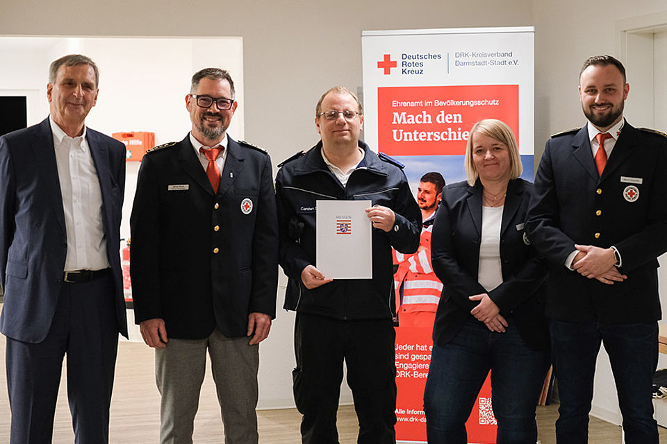 Wer sich im Katastrophenschutz ehrenamtlich engagiert, trägt aktiv dazu bei, die Gesellschaft krisenfester zu machen. Welche schlagkräftige Rolle das Ehrenamt im Krisenfall spielt, hat die Großübung in Darmstadt-Arheilgen gezeigt, an der 250 Ehrenamtliche von insgesamt 300 Einsatzkräften mitgewirkt haben. Im DRK-Katastrophenschutz sind die ehrenamtlichen Helferinnen und Helfer oft über Jahrzehnte aktiv – ein herausragendes Engagement, dass das Land Hessen mit Katastrophenschutz-Medaillen in Bronze, Silber und Gold sowie mit Anerkennungsprämien bis zu 1.000 Euro ehrt. Vergangenen Donnerstag wurden im Rahmen einer Feierstunde 12 ehrenamtliche Einsatzkräfte aus den Bereitschaften der DRK-Ortsvereine Arheilgen-Wixhausen, Darmstadt-Mitte und Eberstadt für ihre besonderen Dienste gewürdigt. Die Ehrungen übernahmen stellvertretend Oliver Krah, Rotkreuzbeauftragter, die Kreisbereitschaftsleitungen Marcel Büchner und Christin Krause sowie Dr. Martin Hostalek. Der Vorsitzende des DRK-Kreisverbands Darmstadt-Stadt e. V. dankte allen für ihre außerordentliche Leistung: „Ihr Einsatz ist für eine humanitäre Gesellschaft in hohem Maße wertvoll. Wir wissen, dass dafür viel gefordert wird: Neben Zeit, Engagement und Teamgeist ist es die Freizeit, die oftmals zu Lasten des Familienlebens geht.“ Leider laufe das verantwortungsvolle Ehrenamt häufiger unter dem Radar, so Dr. Martin Hostalek. Paul Georg Wandrey, Katastrophenschutzdezernent der Stadt Darmstadt, ergänzte, „Sie alle leisten einen wichtigen Beitrag zur Gefahrenabwehr der Wissenschaftsstadt Darmstadt. Wir wissen Ihre Arbeit sehr zu schätzen.“ Neben dem Stadtrat war auch Christian Wagner, Brandoberrat und stellvertretender Amtsleiter der Feuerwehr Darmstadt, der Einladung zur Feierstunde gefolgt.