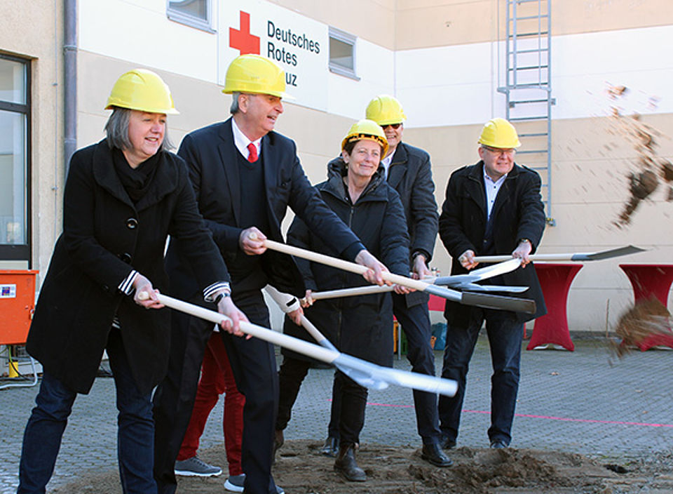 Auf dem Gelände des DRK-Kreisverbands Darmstadt-Stadt e. V. (DRK Darmstadt) entsteht in den kommenden Monaten ein neues DRK-Tageszentrum für das Mornewegviertel und den gesamten Innenstadtbereich. Der erste Spatenstich erfolgte am 2. März durch Bürgermeisterin Barbara Akdeniz, Stadtkämmerer André Schellenberg, Birgit Koss, Leitung Amt für Soziales und Prävention der Wissenschaftsstadt Darmstadt, Dr. Martin Hostalek, Präsident des DRK Darmstadt, DRK-Geschäftsführer Jürgen Frohnert und der Einrichtungsleitung der DRK-Tageszentren, Heike Kasten. Zu den weiteren Gästen zählten unter anderem Johann Braxenthaler, Leitender Branddirektor der Wissenschaftsstadt Darmstadt, sowie Andrea Milosic, Leitung Bauaufsichtsamt der Wissenschaftsstadt Darmstadt. Die Inbetriebnahme des neuen Tageszentrums ist für September dieses Jahres geplant. „Die Tagespflege ist ein wesentlicher Versorgungsbaustein in der Altenhilfestruktur. Sie ermöglicht Menschen mit Pflege- und Betreuungsbedarf die Teilhabe am sozialen Leben. Tagespflege fördert die individuellen Fähigkeiten und das Wohlbefinden Betroffener. Gleichzeitig ist sie eine große Entlastung für Angehörige. Mit diesem neuen Tageszentrum tragen wir unter anderem der Pflegebedarfsplanung der Wissenschaftsstadt Darmstadt Rechnung. Wir freuen uns, dafür das DRK Darmstadt als einen erfahrenen Partner gewonnen zu haben“, sagte Bürgermeisterin Barbara Akdeniz. André Schellenberg, der als Dezernent für das Gesundheitsamt und die Feuerwehr zuständig ist, lobte zudem die stets zuverlässige Zusammenarbeit mit dem DRK in Darmstadt insbesondere bezogen auf den Katastrophenschutz und die Pandemie-Bekämpfung.