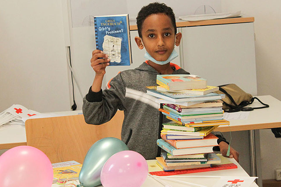 Dienstagnachmittag im Erstwohnhaus für Geflüchtete in der Otto-Röhm-Straße: Elf Kinder aus Afghanistan, Somalia und Syrien mit stapelweise Büchern auf den Armen strömen zum Gemeinschaftsraum, in dem die DRK-Leseförderung des DRK Darmstadt stattfindet. Dieses Mal ist ein besonderer Tag, denn nach einem Jahr Leseförderung werden einige Kinder aus diesem Projekt verabschiedet. Im Rahmen einer kleinen Abschiedsfeier präsentieren sie die Bücher, die sie in dieser Zeit gelesen haben und stellen ihr Lieblingsbuch vor: „Gregs Tagebuch“ und „Adele malt die Welt bunt“ sind darunter. Beliebt sind auch die Duden-Kinderbuch-Titel wie „Eine Pizza für Sophie“ oder „Lucie findet einen Vogel“. Die Kinder sind stolz auf die Bücher und ebenso auf sich selbst. Zu Recht: „Viele von ihnen haben in kürzester Zeit enorme Fortschritte im deutschen Spracherwerb, im Lesen und Verstehen gemacht“, schildert Hanaa Badra. Die Grundschullehrerin aus Syrien ist eine der DRK-Lesepatinnen, die das Projekt umsetzen. Wie beeindruckend die Entwicklung ist, demonstriert der achtjährige Zana aus Syrien, der flüssig aus seinem Lieblingsbuch „Ein Fohlen kommt zur Welt“ vorliest. Seine zehnjährige Schwester Rojin fasst ihre Lieblingsgeschichte „Tigerjagd um Mitternacht“ mündlich zusammen. Ebenso große Lesemäuse sind Sam (8) und Rakieb (7) aus Eritrea. Deren Mutter erklärt, dass ihr Sohn Sam leidenschaftlich gern Fußball spielt, aber für die Lesestunden alles stehen und liegen lässt.