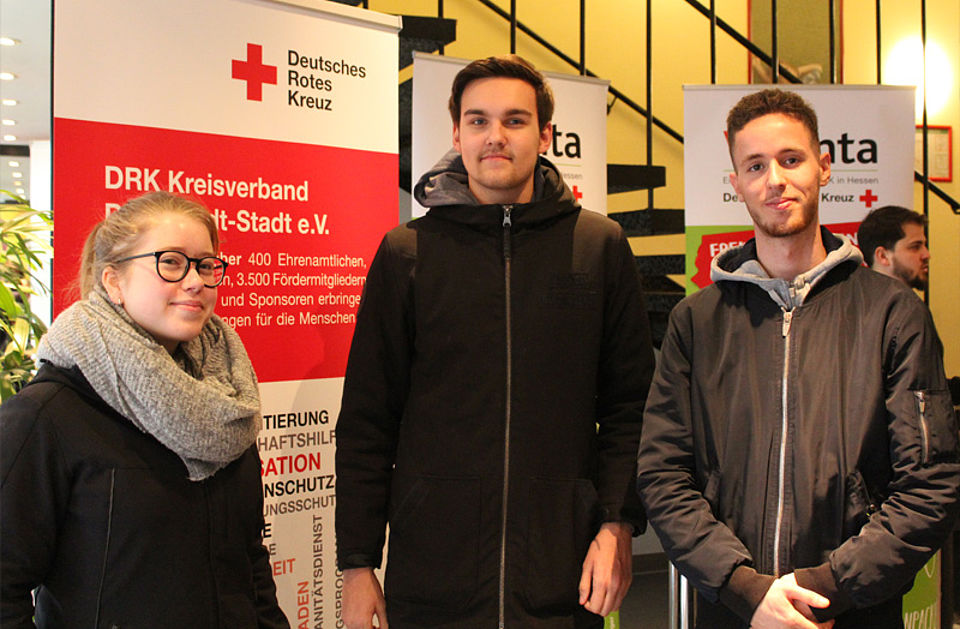 Zum Schluss der Veranstaltung konnten sich die Schülerinnen und Schüler an den Ständen des DRK Darmstadt und Volunta sowie bei zwei Vertretern der Bergwacht Darmstadt-Dieburg über die Arbeit des Roten Kreuzes und über mögliche Freiwilligendienste informieren.