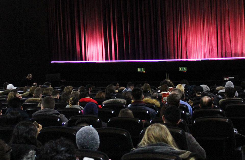 Rund 200 Schülerinnen und Schüler der Martin-Behaim-Schule (MBS) drängten sich am Donnerstagmorgen kurz vor 9 Uhr vorm Darmstädter Pali-Kino. Einige deckten sich für ein echtes Kino-Feeling mit Popcorn oder Nachos ein. Dabei war der Film, den sich die jungen Leute im Anschluss anschauten alles andere als leichte Kost: Markus Imhoof widmet sich in seinem bereits mehrfach ausgezeichneten Dokumentarfilm „Eldorado“ dem Themenkreis Flucht und Fluchtursachen. Fragen und Inhalte, die sich für die pädagogische Arbeit eignen – und das genau hat die MBS im ersten Schulhalbjahr 2018/2019 aufgegriffen. Die aktuelle Flüchtlingsbewegung war unter anderem im Deutsch- und Englischunterricht Schwerpunktthema. „Eldorado“ sollte nun den schulischen Unterricht realitätsnah ergänzen. Wir freuen uns sehr, dass das DRK Darmstadt diese Veranstaltung angeregt hat“, sagte Studiendirektorin und Mitglied der erweiterten Schulleitung der MBS Elisabeth Christ zur Begrüßung. Das DRK Darmstadt, das auch im Rahmen des Schulsanitätsdienstes mit der MBS kooperiert, hatte diesen Vorschlag unterbreitet, um im Anschluss an den Film einen Einblick in die Hilfe sowie die Integrationsarbeit vor Ort zu geben.